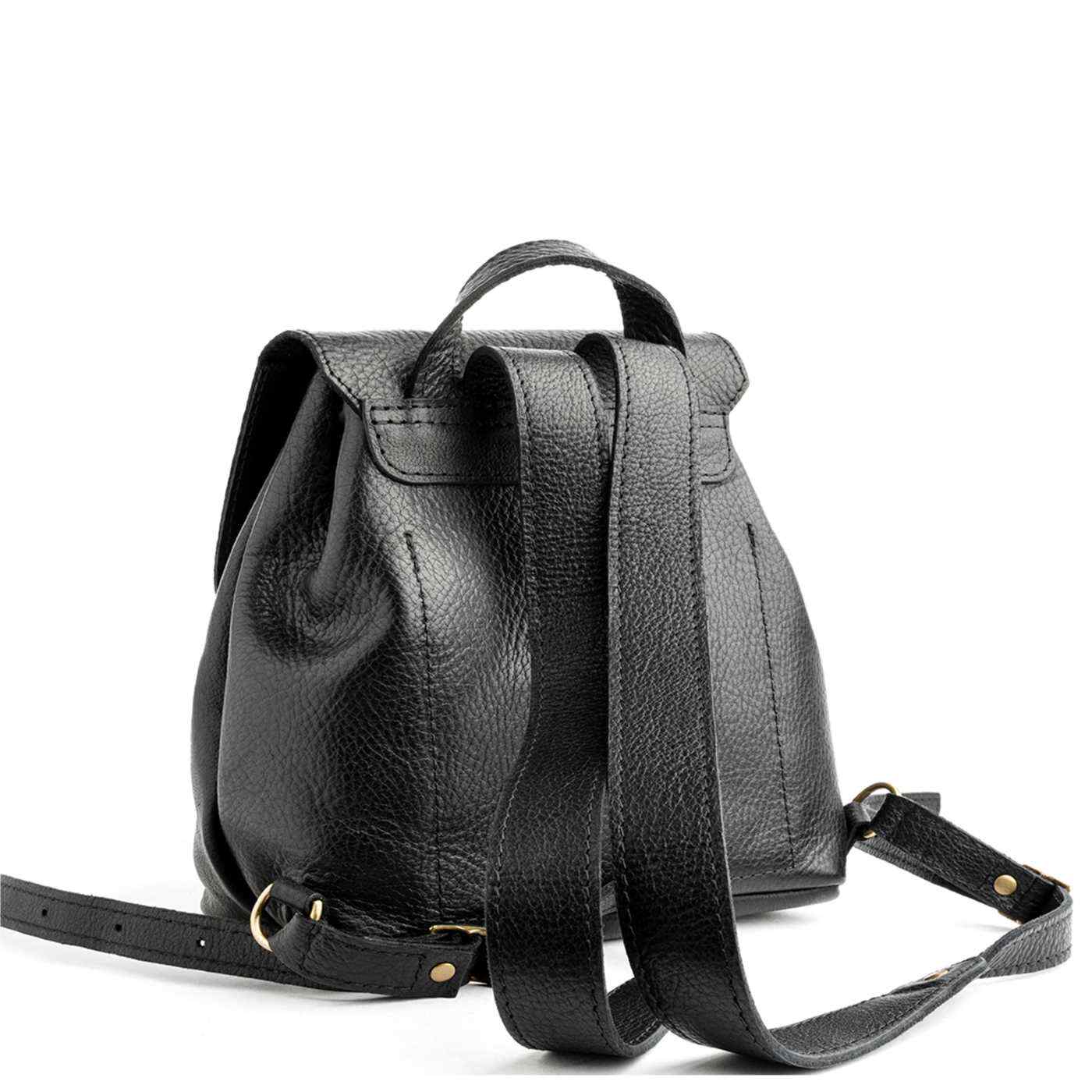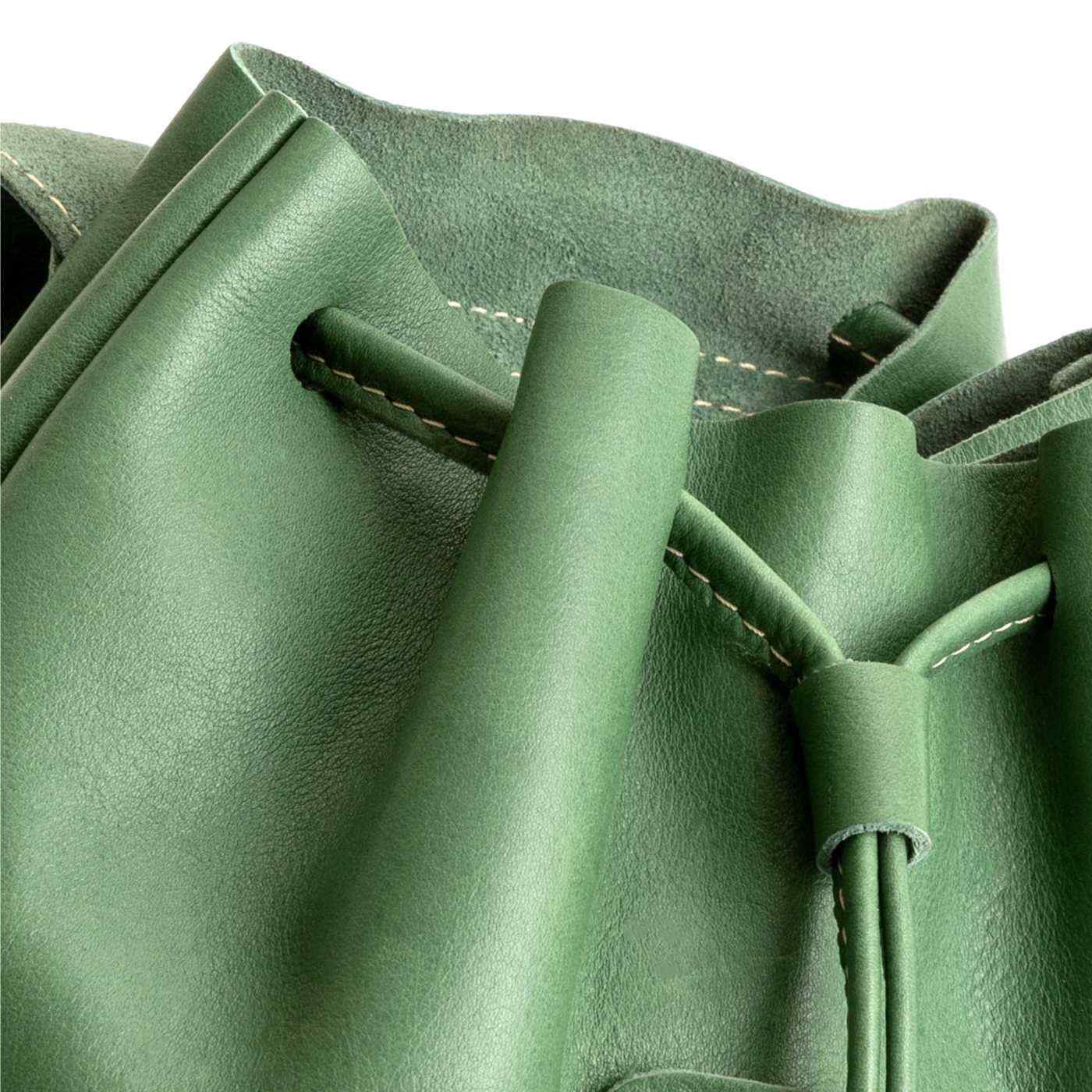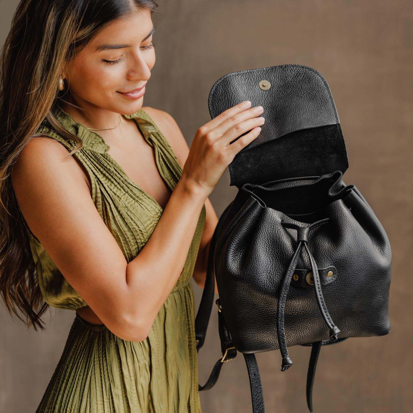 - Relaxed leather drawstring and sturdy magnetic flap closure