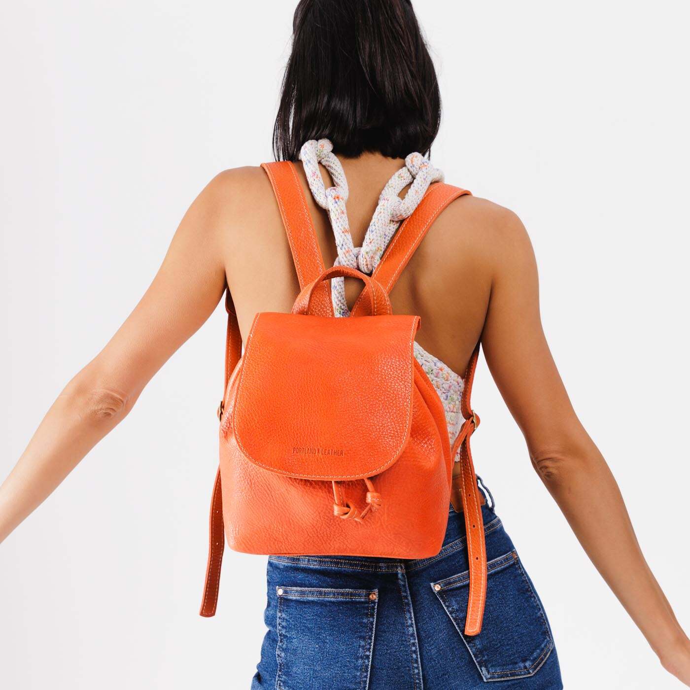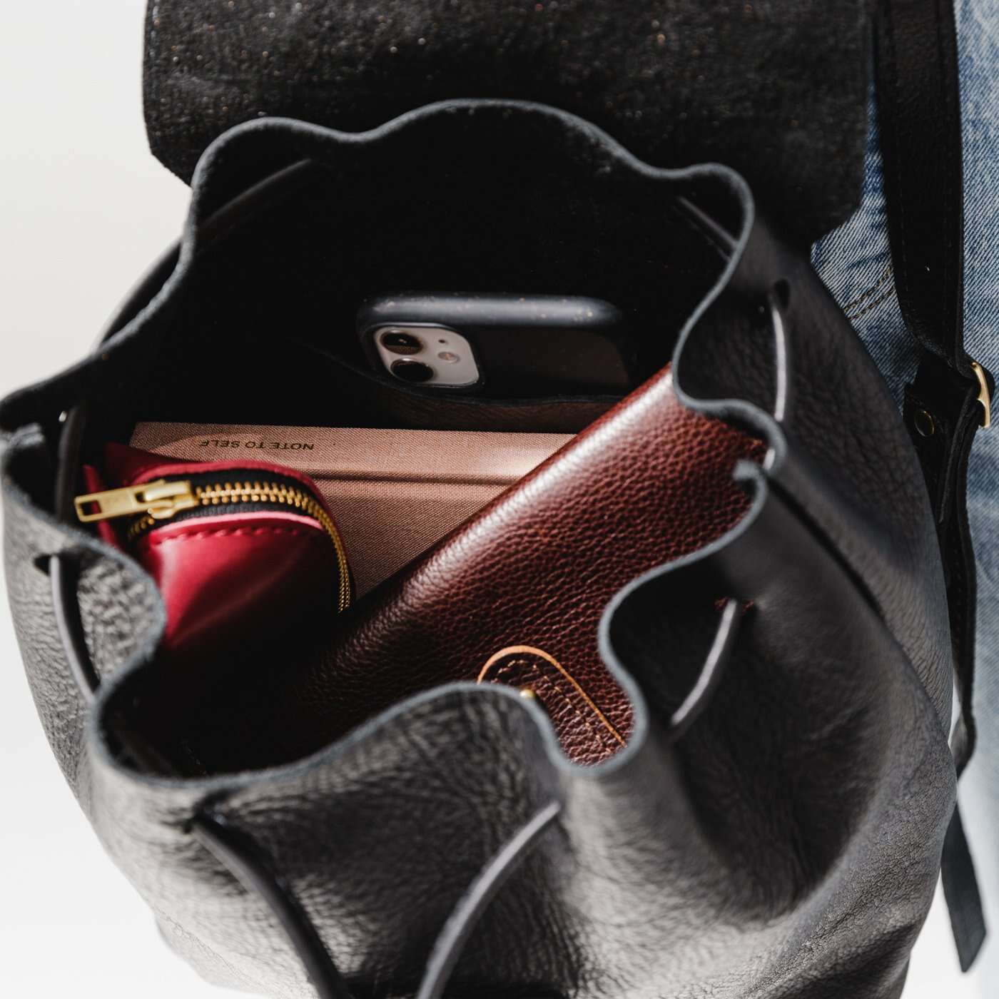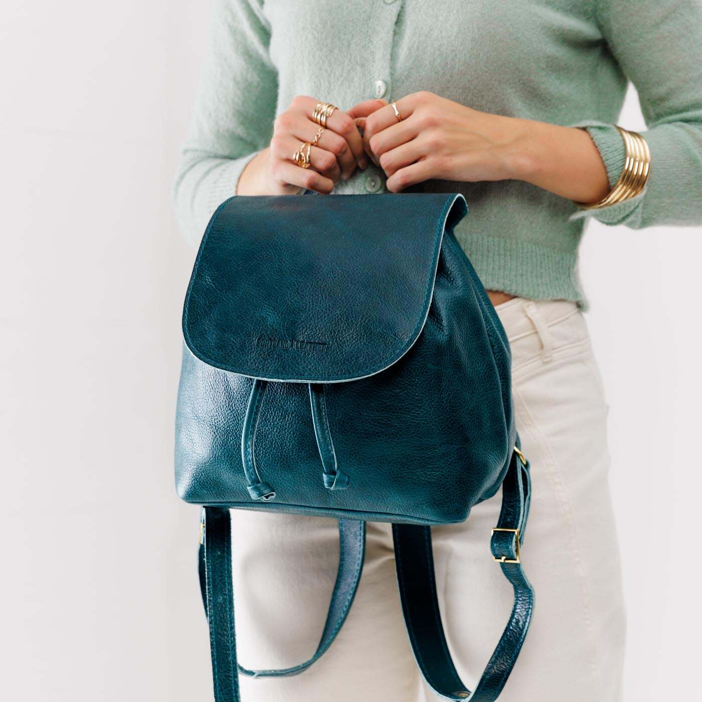 - Relaxed leather drawstring and sturdy magnetic flap closure