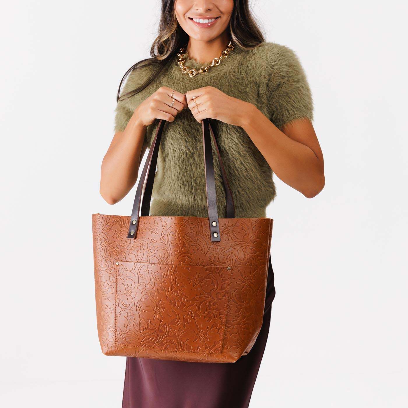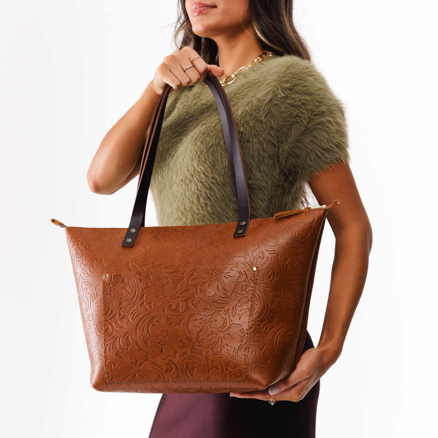 • Antiqued brass rivets look great with both silver and gold accessories