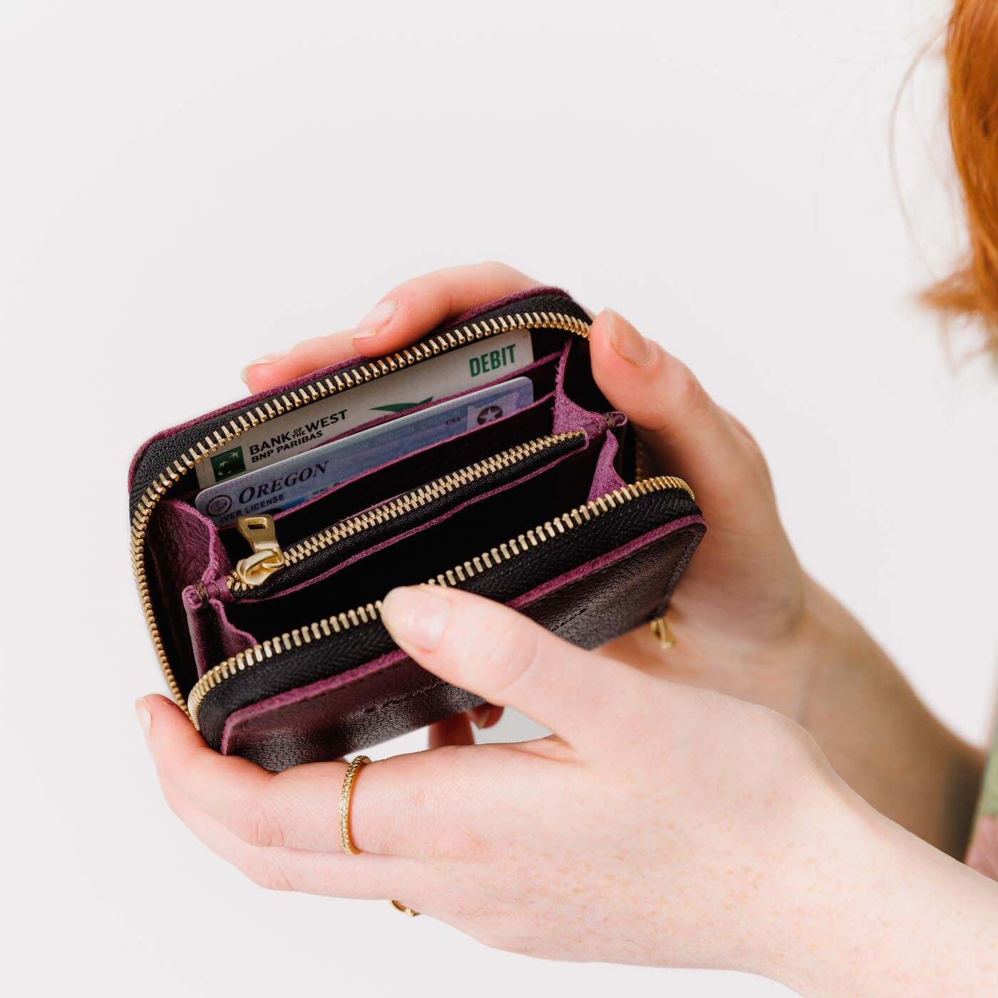 - 4 card slots, 2 large pockets for cash, and a zippered coin pocket